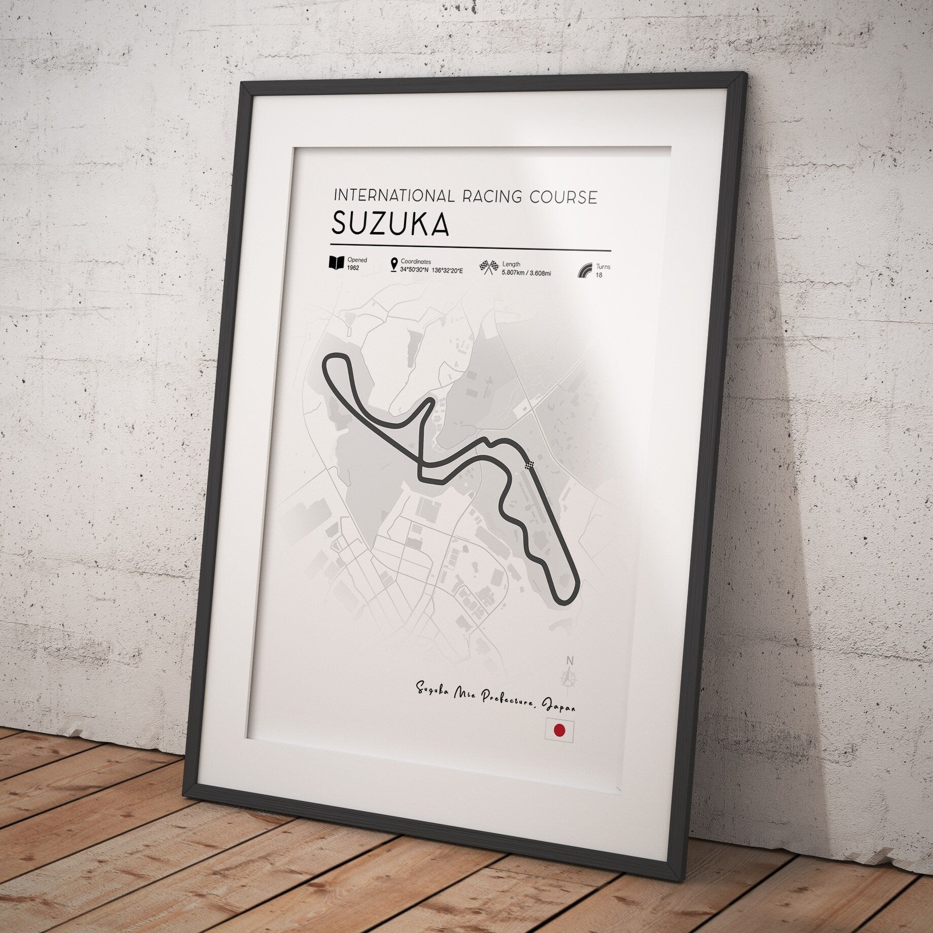 This high resolution printable Formula 1 wall art includes beautiful typography detailing the track length, corners, coordinates and date of construction of the Suzuka Race Track .