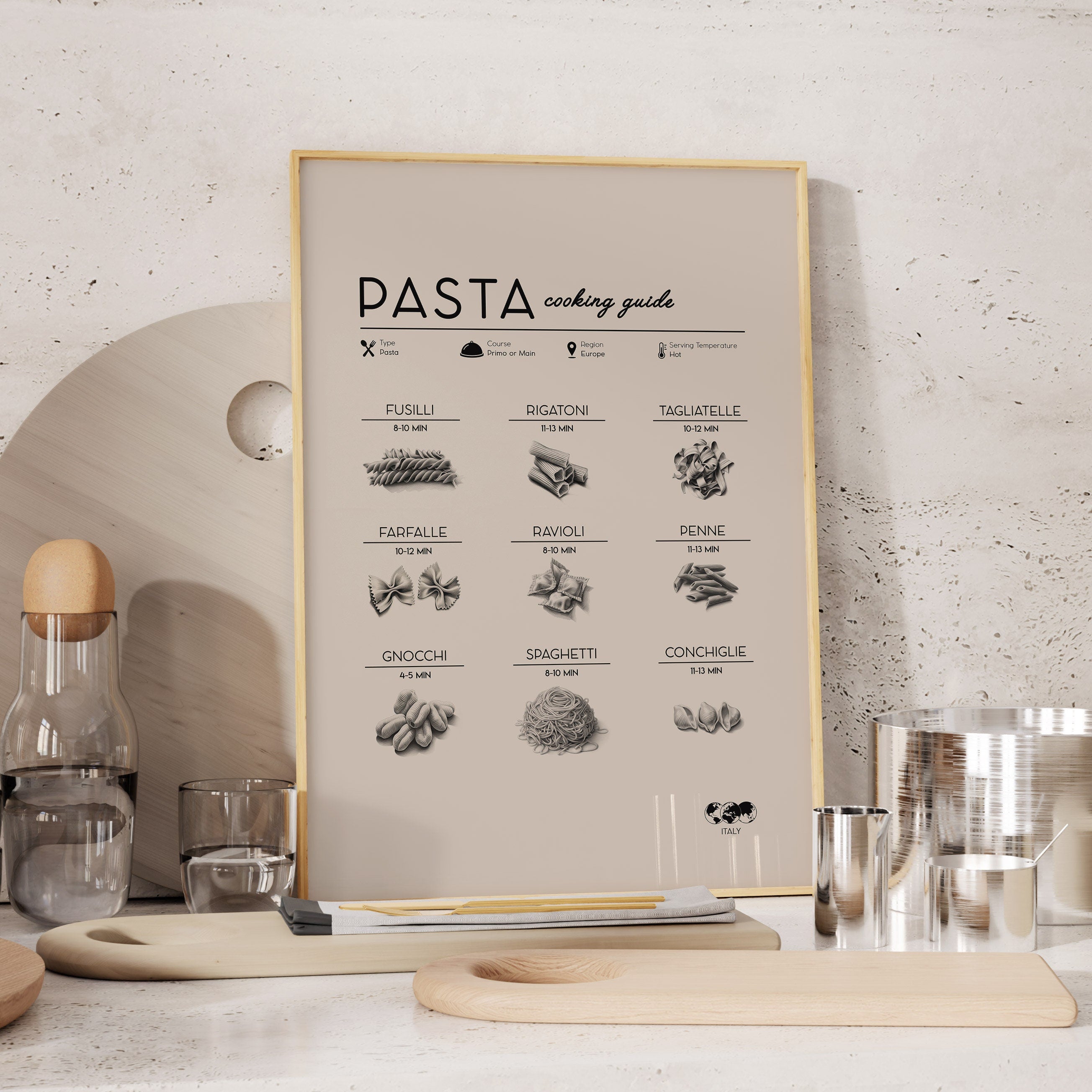 This Italian Pasta guide is the perfect blend of form and function and the ultimate addition to your kitchen wall art. This digital art print is a delightful fusion of design, culture, and nostalgia - a simple modern kitchen print that makes a perfect gift for foodies, travel enthusiasts, and lovers of unique kitchen decor and kitchen art. 🥧