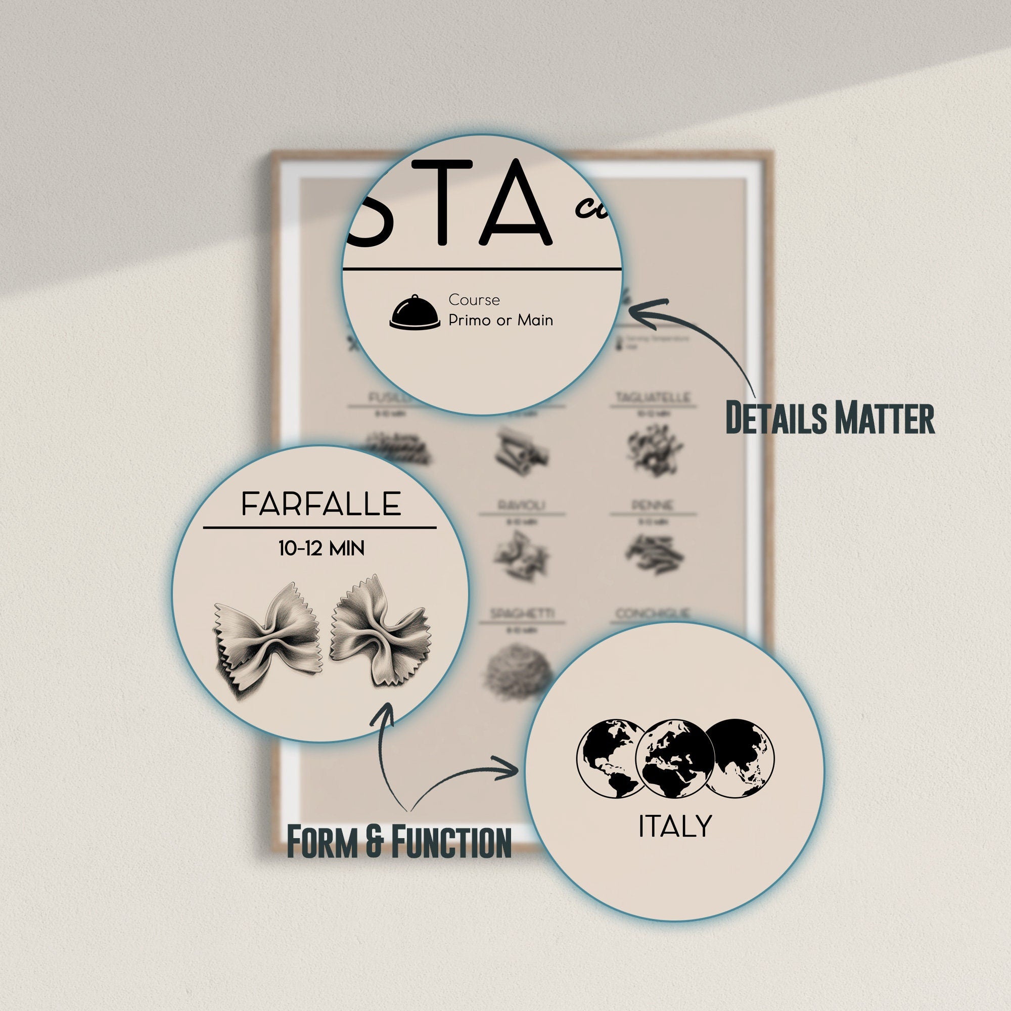 Beautiful typography and stunning illustration make this pasta poster a striking addition to your kitchen, dining room, or any room that could use a touch of global flavor. 🖼️