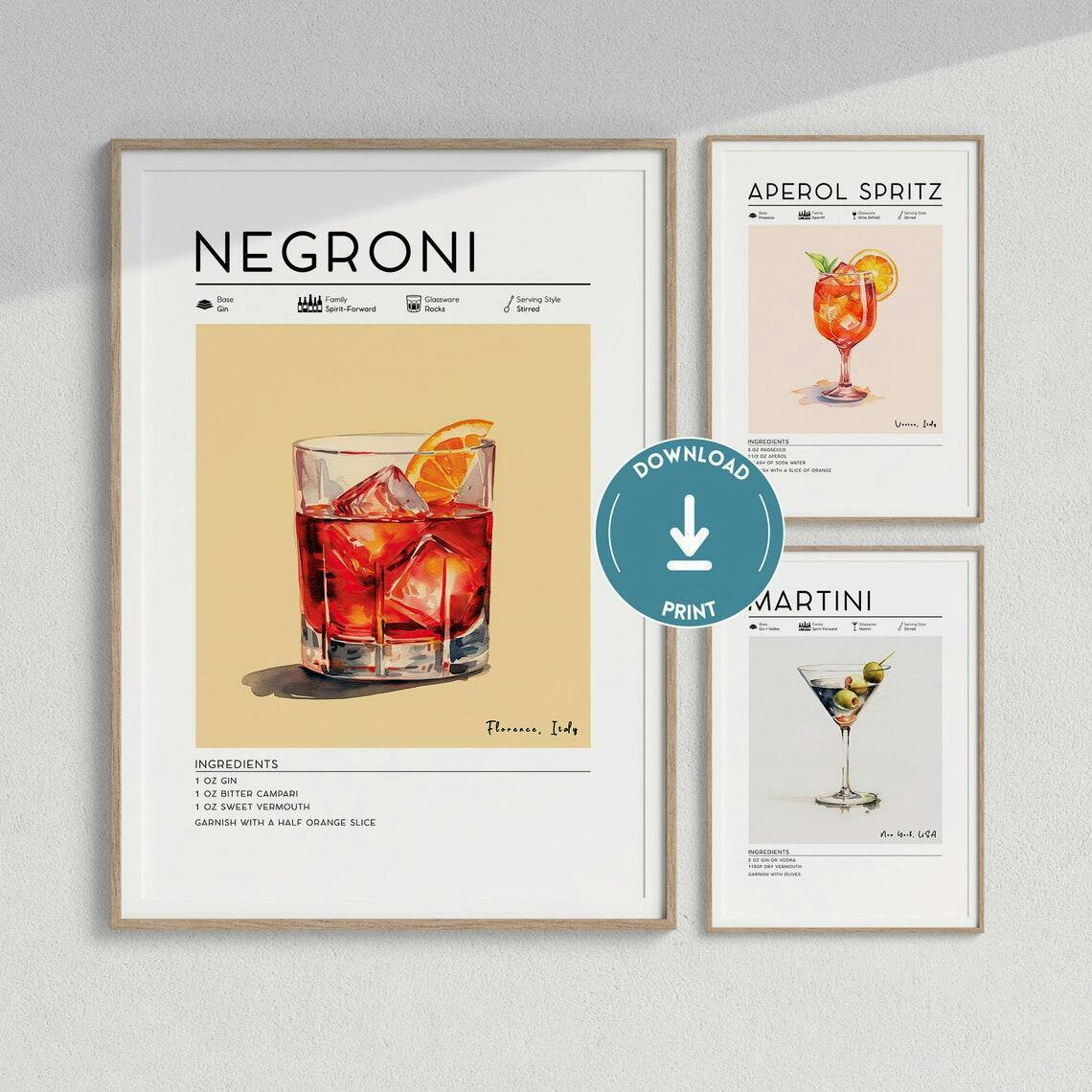 This print set features three classic drinks: Negroni, Martini and Aperol Spritz.